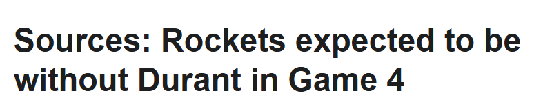北京时间4月27日,据ESPN名记Shams报道,火箭将于今日迎来生死战,一旦落败就将止步季后赛,但球队头号得分手杜兰特将无法出战。Shams表示,杜兰特预计将继续缺席系列赛第四场。